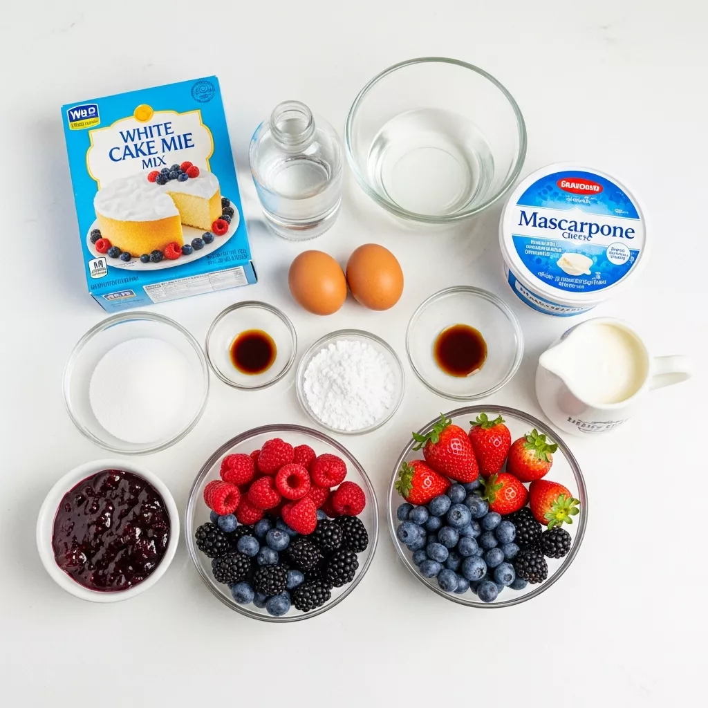 - In a large trifle bowl, layer half of the cake cubes, spread half of the berry preserves, half of the mascarpone cream, and top with half of the fresh berries.
