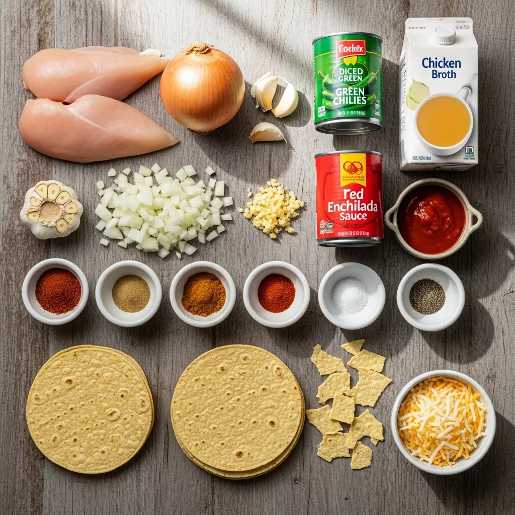 Crockpot chicken enchilada casserole makes every moment feel satisfying. Place the boneless, skinless chicken breasts at the bottom of your slow cooker. Evenly sprinkle the diced onion, minced garlic, diced green chilies (undrained), chili powder, ground cumin, smoked paprika, salt, and black pepper over the chicken.