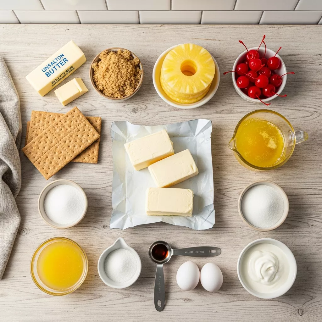 - For the graham cracker crust, combine graham cracker crumbs, 1/4 cup granulated sugar, and 6 tablespoons melted butter in a medium bowl. Mix until well combined and crumbly. Carefully press the crumb mixture evenly over the pineapple topping in the springform pan. Do not press too firmly, just enough to form a compact layer.